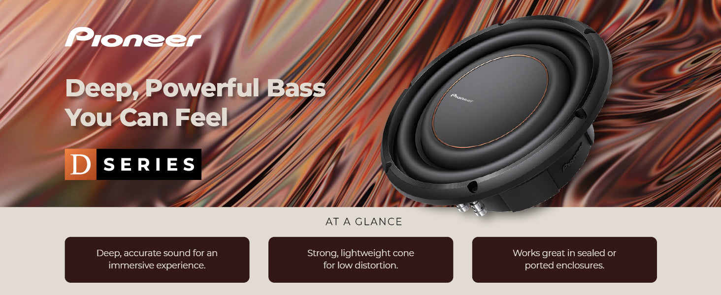 The D subwoofer is a culmination of Pioneer technologies that produce thick, deep, powerful, and accurate bass, making listening to your favorite music energetic, fun, and engaging. It combines bass quality and quantity with high power handling and installation flexibility, providing high performance in both acoustic suspension (sealed) and bass reflex (ported) enclosures. The D subwoofer is the ultimate all-around performer. Don’t just listen to your music—feel it.