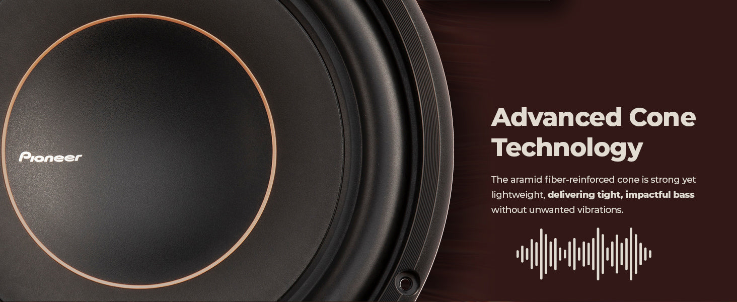 The design of a slim subwoofer requires a smaller distance between the front and rear suspensions (spider) of the subwoofer, reducing their effectiveness in maintaining the required linearity during low-frequency excursions. To counter this problem, Pioneer has developed a dual rear suspension design (Conex), which increases the precision of movement without increasing mechanical resistance. The goal is simple: to provide all the details of your music while offering excellent control during long excursions and maintaining a small footprint in your car.
